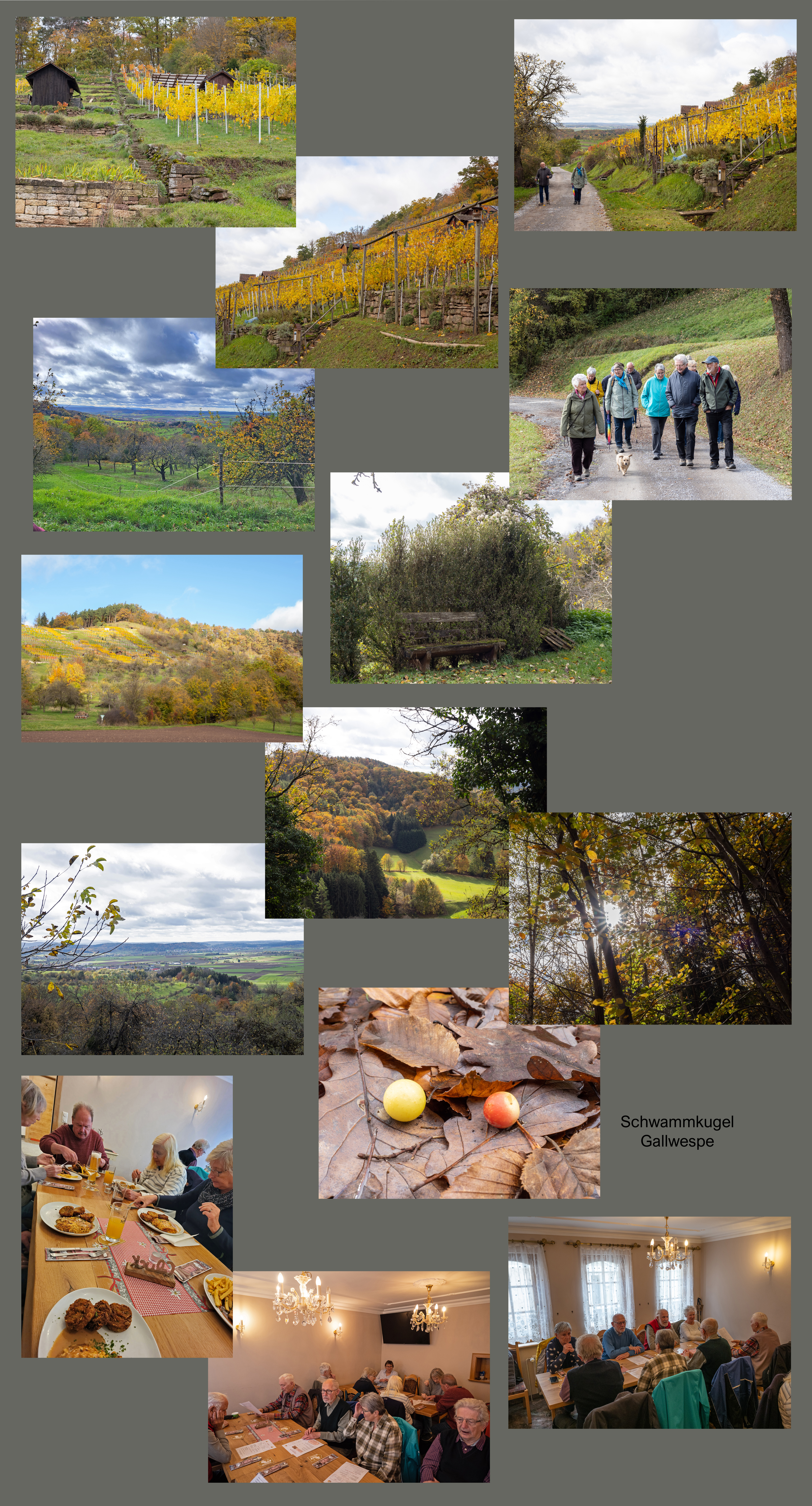 In Fahrgemeinschaften fuhren wir ca. 40 km zum Start unserer Wanderung am Parkplatz am Friedhof in Breitenholz. Dort steht das Heizwerk des beispielhaften Bioenergiedorfes mit „Nah-Wärme“ aus Hackschnitzel-Heizung, Solar-Thermie und Photovoltaik. Über 94 % der Häuser sind angeschlossen. 1000 m³ Wärmespeicher sichern Stetigkeit der Versorgung. Dort ist auch die Infovitrine mit Wanderkarte für den Giggelesweg und die Spitzwegrunde. Ein dichtes Wegenetz ermöglicht viel Möglichkeiten zu eigenen Entdeckungen. Besonders reizvoll ist der Weg am Fuß der Weinberge mit Aussicht zur Schwäbischen Alb. KI weiß nichts von den Weinbergen, aber in dem guten Gasthof gibt es auf Nachfrage Breitenholzer Weine. Den tranken wir dann auch mit Genuss, koi Semsakrebsler.