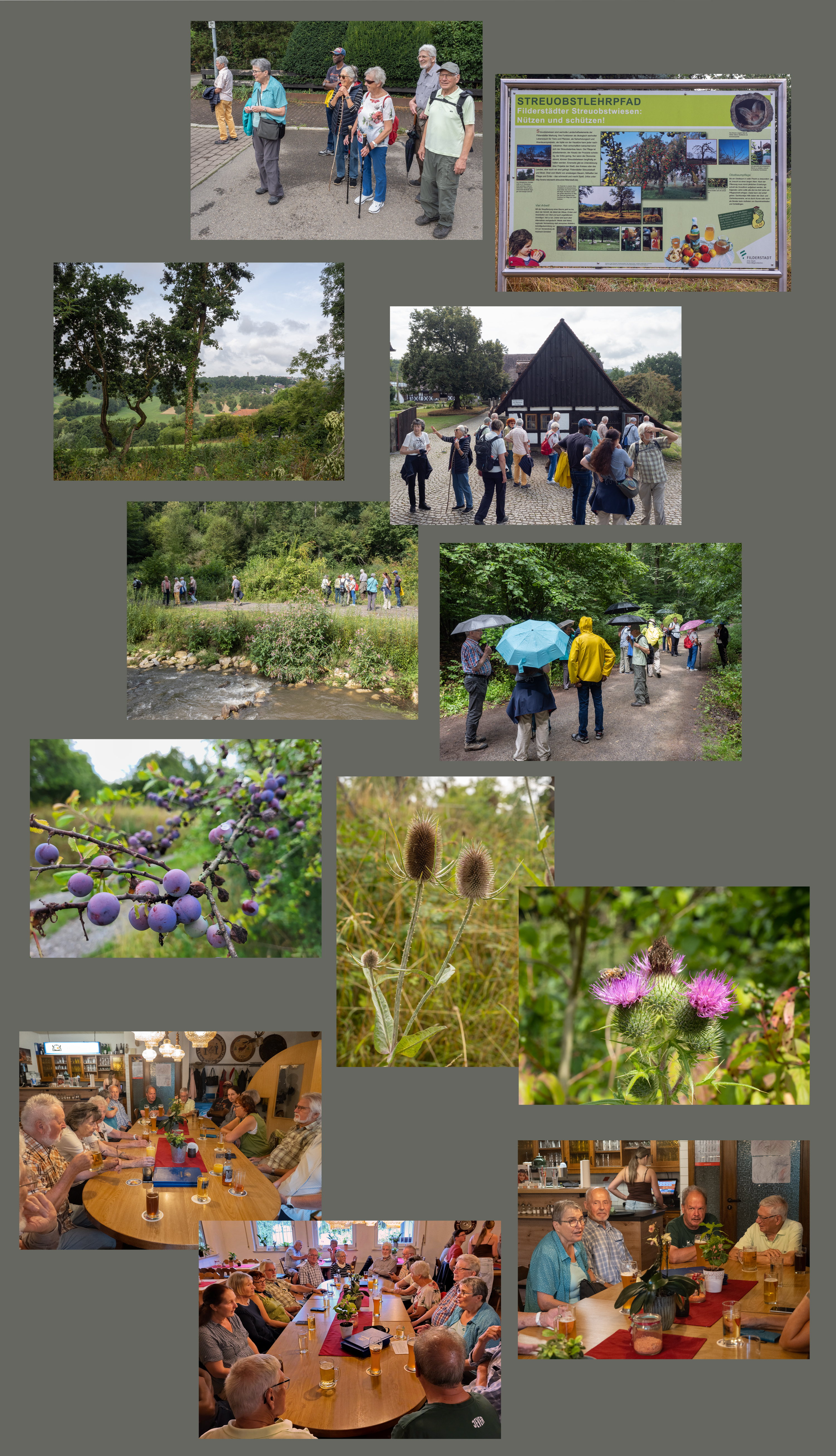 Eine stattliche Zahl von 22 NaturFreunden und Gästen traf sich um 10 Uhr bei (noch) schönem Wetter am Uhlbergparkplatz in Bonlanden. Hier begann unsere Tour über die Unterdorfstraße und am Friedhof vorbei weiter auf dem Streuobstlehrpfad zum Hofgut Gutenhalde. Das beeindruckende Anwesen in der schönen Landschaft verdiente einen Stopp. Weiter ging es bergab, durch das Bombachtal und durch Felder und Wiesen wieder hoch in den Wald, der passende Ort für den „Gipfelschnaps“. Bald darauf endete leider das schöne Wetter: Kurz vor dem Schützenhaus wurden wir mit einem ordentlichen Regenguss bedacht. Im Gastraum genossen wir es, im Trockenen zu sein. An einem schön gedeckten Tisch wartete gutes Essen auf uns. Über die Unterdorfstraße erreichten wir gegen 14:30 Uhr wieder unseren Ausgangspunkt Uhlbergparkplatz. Danke an die Wanderführer Angelika und Peter für eine schöne Wanderung – für viele ohne Anfahrt und fast direkt vor unserer Haustür. (Renate P./Erika W.)
