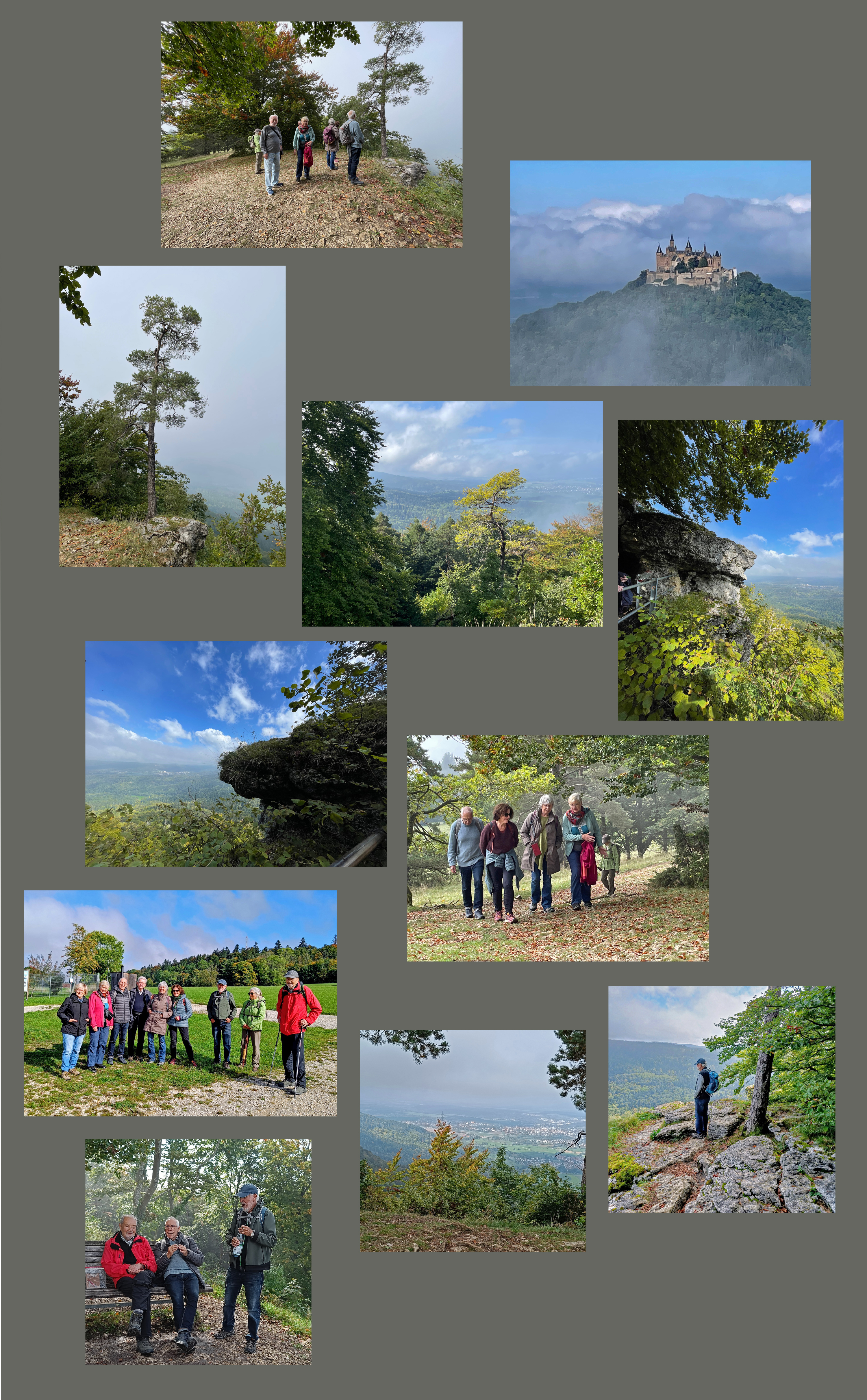 Bei zunächst wolkenverhangenem, diesigem Wetter starteten acht NaturFreunde und zwei Gäste in zwei vollbesetzten Autos nach Albstadt-Onstmettingen zum Parkplatz Skilift Zollernburg/Panorama. Wir waren neugierig und gespannt auf die Ausblicke auf unserer Wanderung entlang der Albtraufkante. Schmale, wurzelbewachsene Pfade, Bäume, die schon den leichten Zauber des goldenen Herbstes angenommen hatten - so präsentierte sich dann unser Weg zum Zeller Horn. Unsere Erwartungen wurden weit übertroffen und es bot sich uns ein zauberhafter Ausblick: Zwischen den vom Tal aufziehenden Nebelschwaden zeichneten sich immer deutlicher die Umrisse der majestätischen Hohenzollernburg ab. Die Sonne verdrängte immer öfter den Nebel und nicht nur unsere Gruppe war begeistert von diesem unvergesslichen Ausblick auf das gesamte Albvorland.