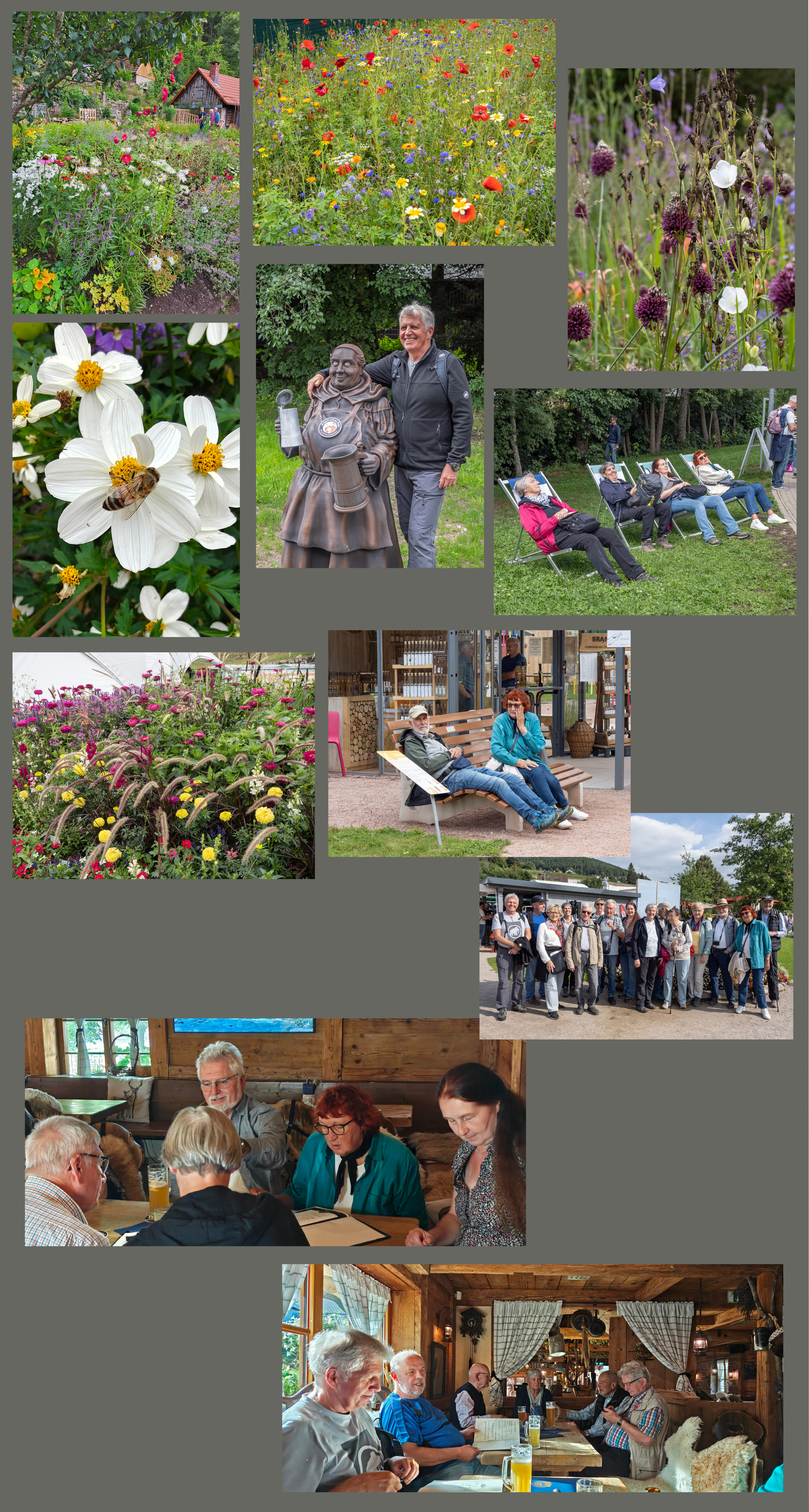Mit einem leckeren Frühstücksbuffet mit großer Auswahl und bei sonnigem Wetter starteten wir in den zweiten Tag mit dem Besuch der Gartenschau Freudenstadt/Baiersbronn. Von Monika und Willi bestens betreut, gelangten wir vom mit großer Blumenpracht ausgestatteten „größten umbauten Marktplatz Deutschlands“ zum Eingang des Gartenschaugeländes und in die malerische Landschaft des Forbachtals. Zur Verfügung stehende Rikschas, Zügle und Busse erleichterten und verkürzten die 8 km lange Strecke des Gartenschaugeländes je nach individuellen Bedürfnissen. Auch unsere NF-Gruppe machte davon Gebrauch. Die diesem Bericht beigefügten Fotos machen deutlich, welch große Blütenvielfalt, Aktionen und Ausstellungen wir sehen und erleben konnten. Zwischendurch stärkten wir uns an den vielfältigen Ständen mit Essen, Getränken oder einer Tüte Eis, das bei der mittlerweile großzügig scheinenden Sonne besonders gut schmeckte. In Baiersbronn endete dann unser Gartenschaubesuch. Von hier aus ging es per S-Bahn zurück nach Freudenstadt. Dort waren wir in einem netten Lokal direkt am Marktplatz zum Abendessen angemeldet. Ein rundum gelungener Tag fand so seinen gebührenden Abschluss. (Erika W.)